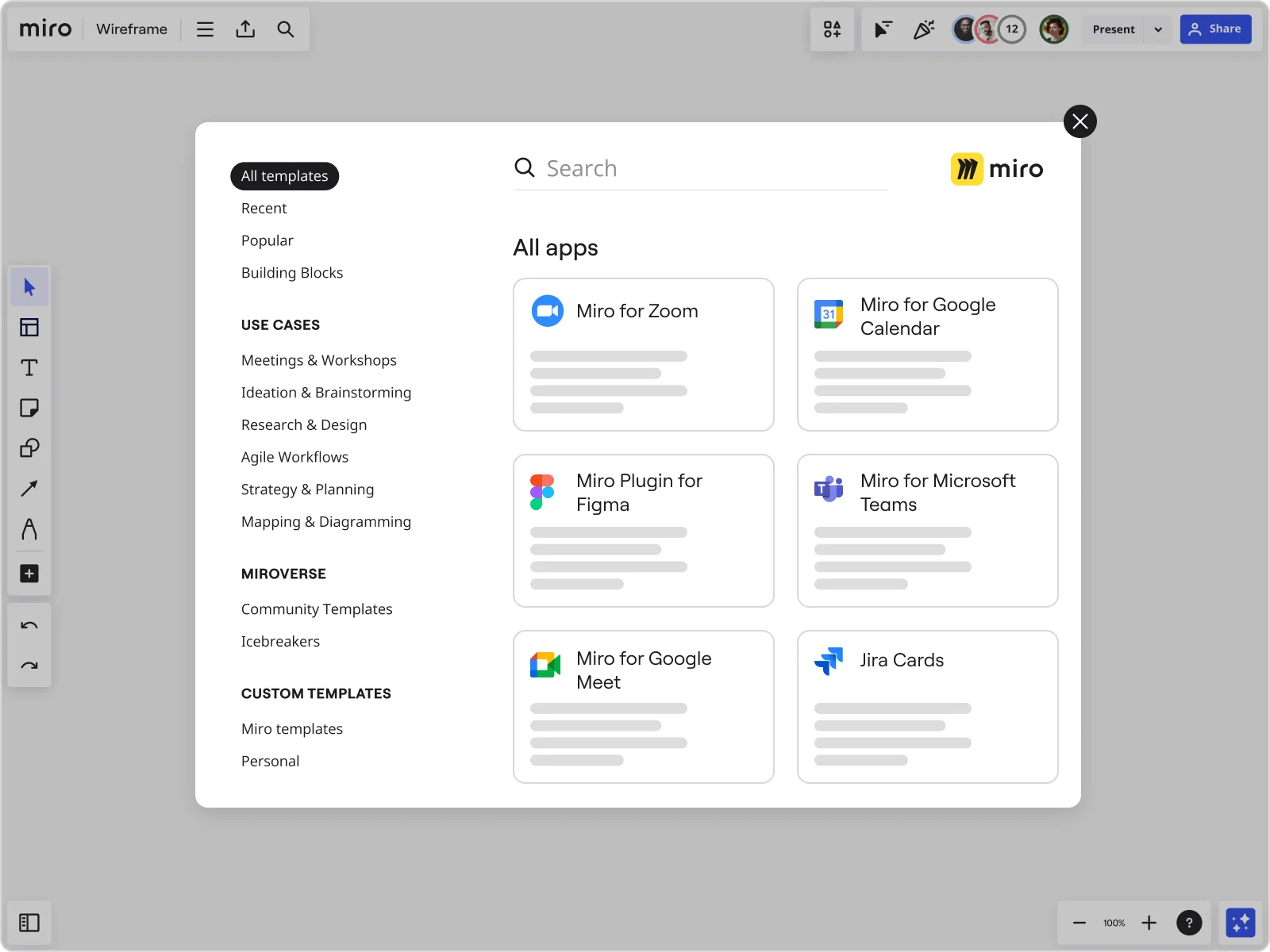 Brug Miro-integrationer med Icon Finder og Unsplash til at skabe klare og tydelige, komplette wireframes til apps og hjemmesider.
