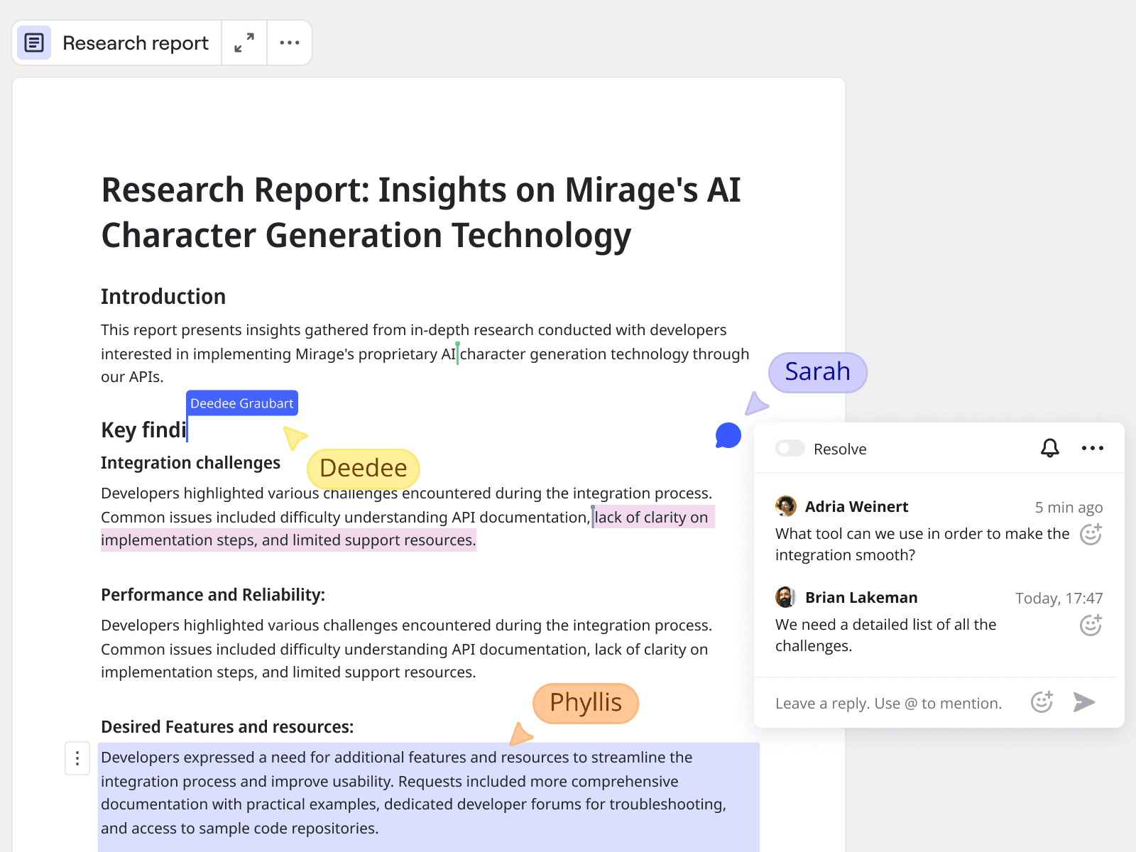 Stay in the flow of collaboration and see exactly where others are working with cursor tracking. Leave inline comments, @mention users for instant notifications, and engage in comment threads and reactions, making teamwork more interactive and efficient.