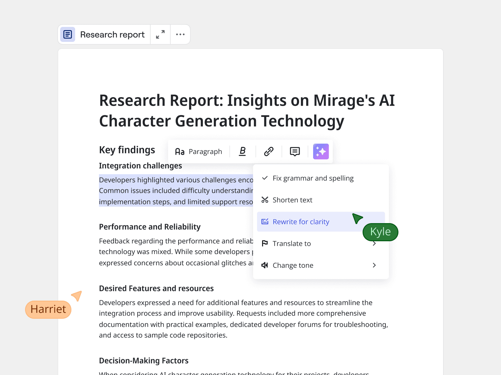 Elevate your writing with AI-powered tools. Rewrite for clarity, correct grammar, translate content, adjust tone, or condense text—all within your Miro workspace.