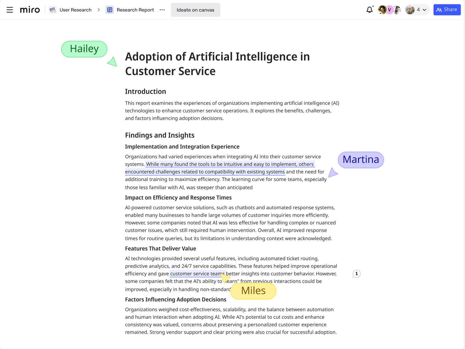 Quickly turn ideas into action with Miro Docs. Go from brainstorming to structured plans—all in one seamless workspace.