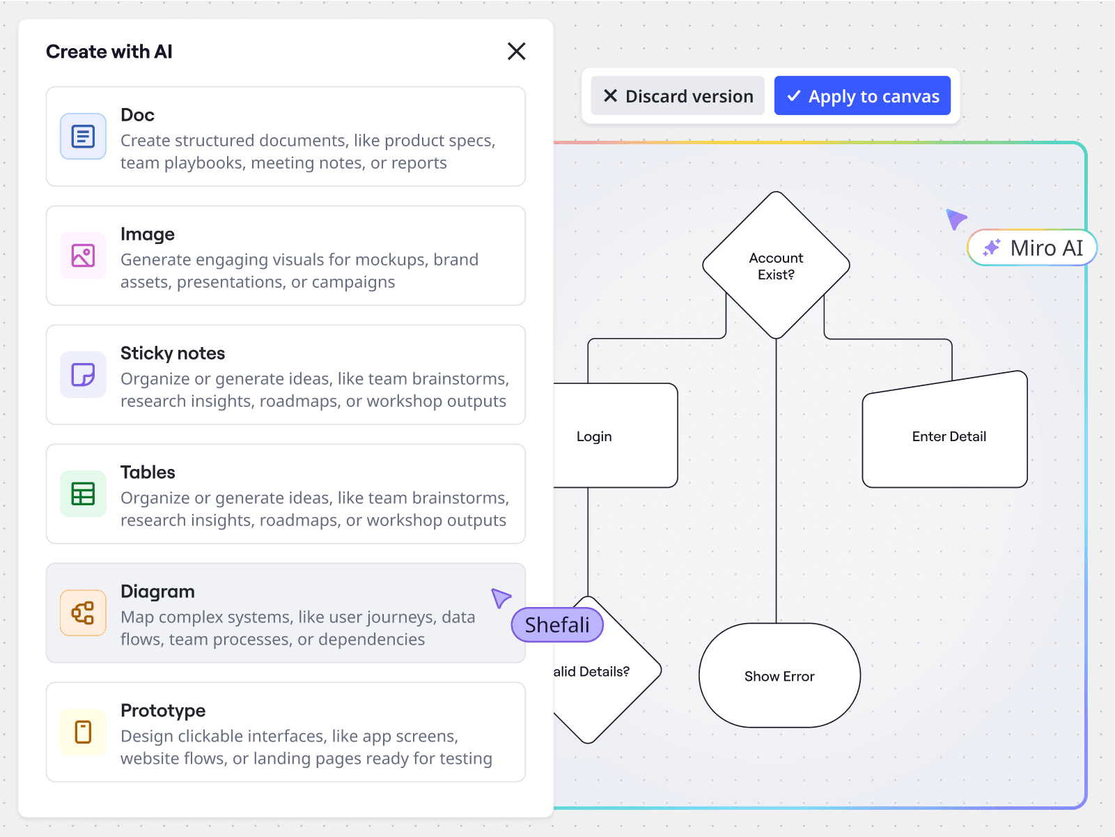 Transform your ideas into polished outputs in minutes. With Miro Al, generate documents, tables, diagrams, prototypes, and images by building off your ideas and adjusting until they meet your needs.