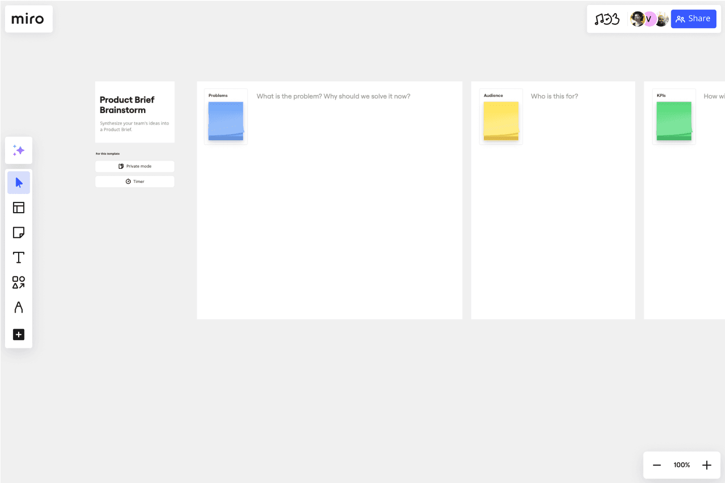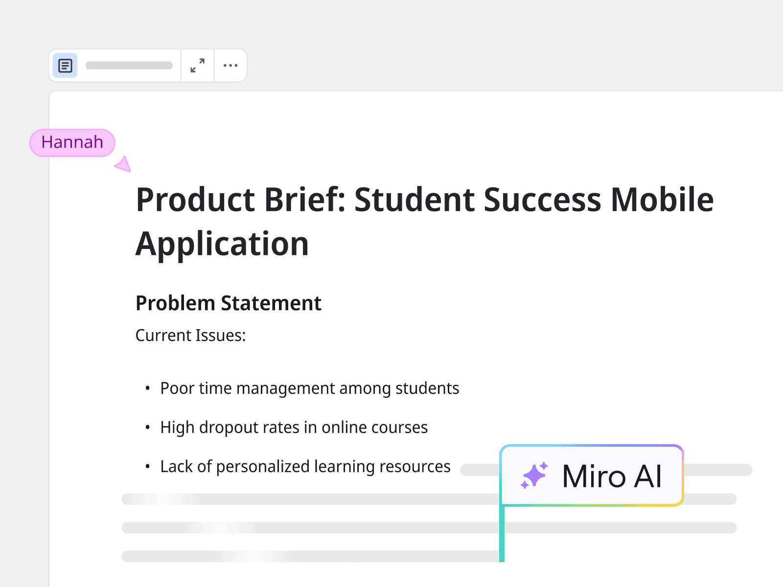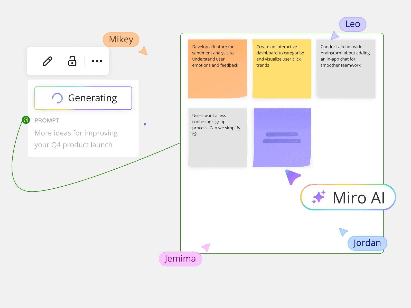 Move from idea to outcome faster with Miro AI. Seamlessly turn ideas on the board into product briefs, prototypes, or roadmaps that drive alignment and impact.