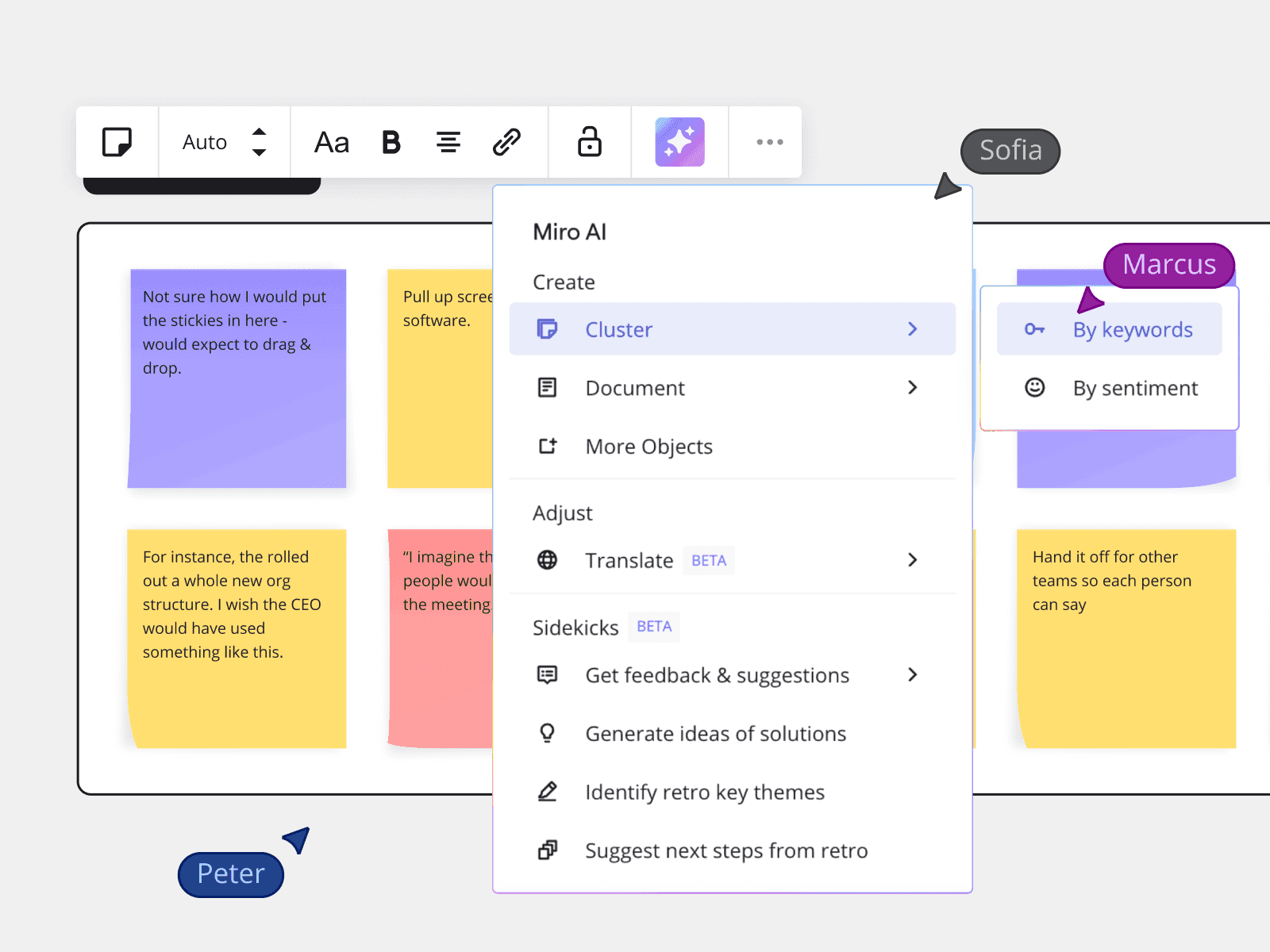 Instantly group together physical or digital sticky notes by sentiment or keywords. Uncover patterns and drive smarter decision making by categorizing ideas in no time.