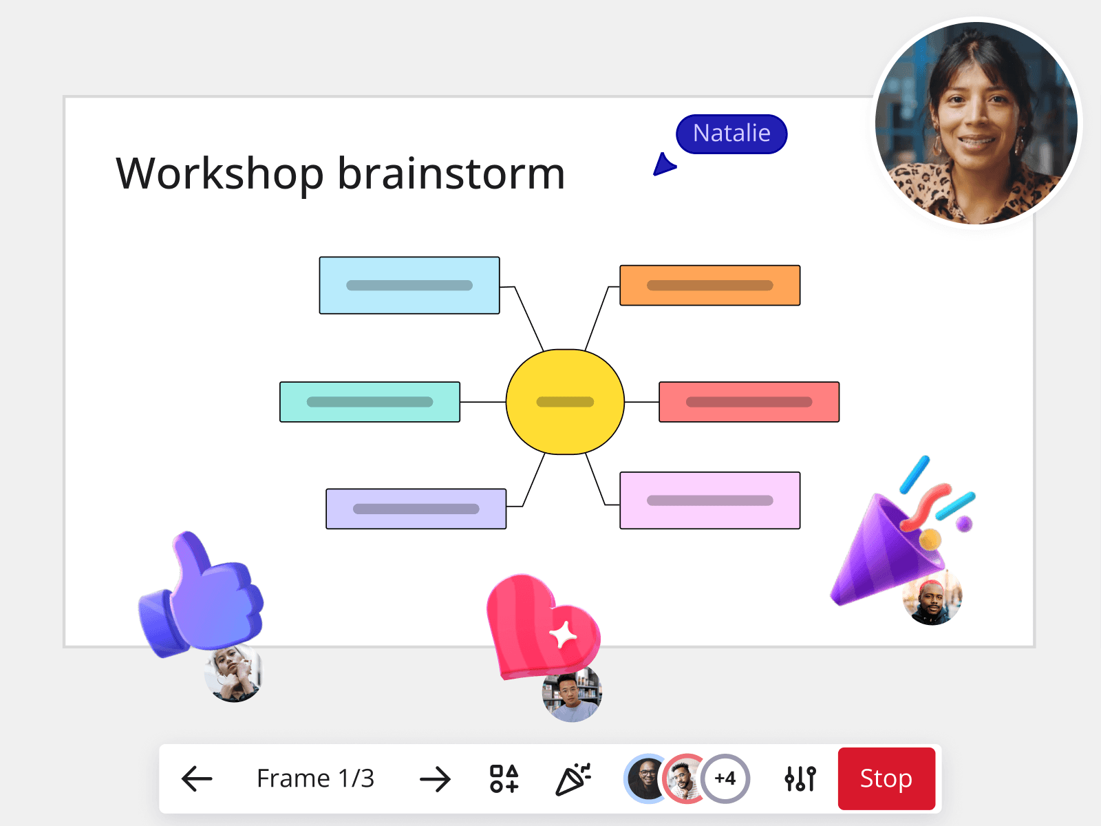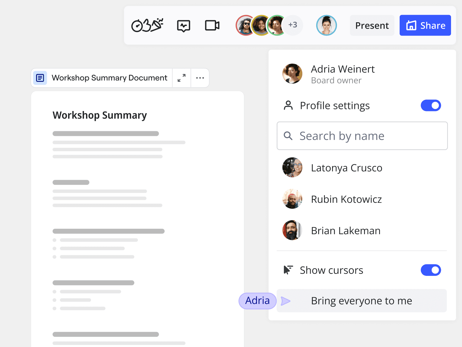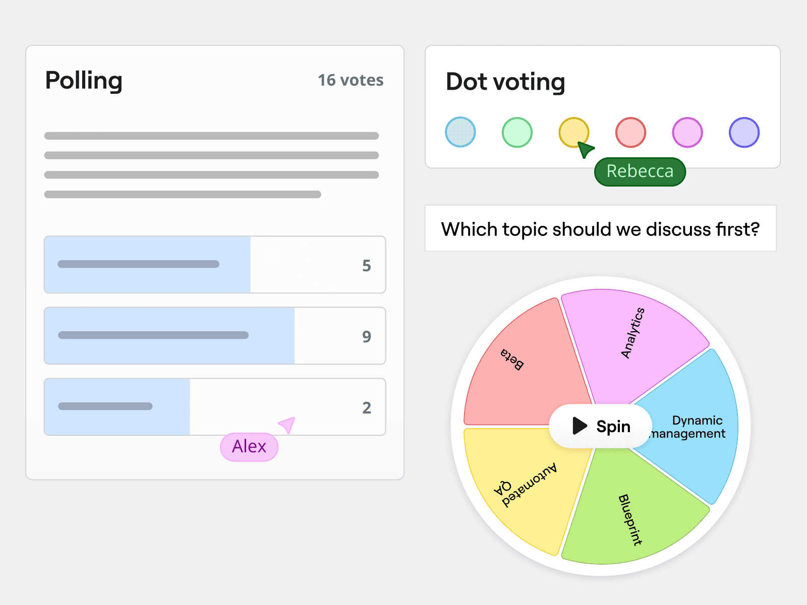 Use fun and intuitive tools like timer, dot voting, polls, alignment scales, and spinny wheels to craft dynamic sessions that get ideas flowing.