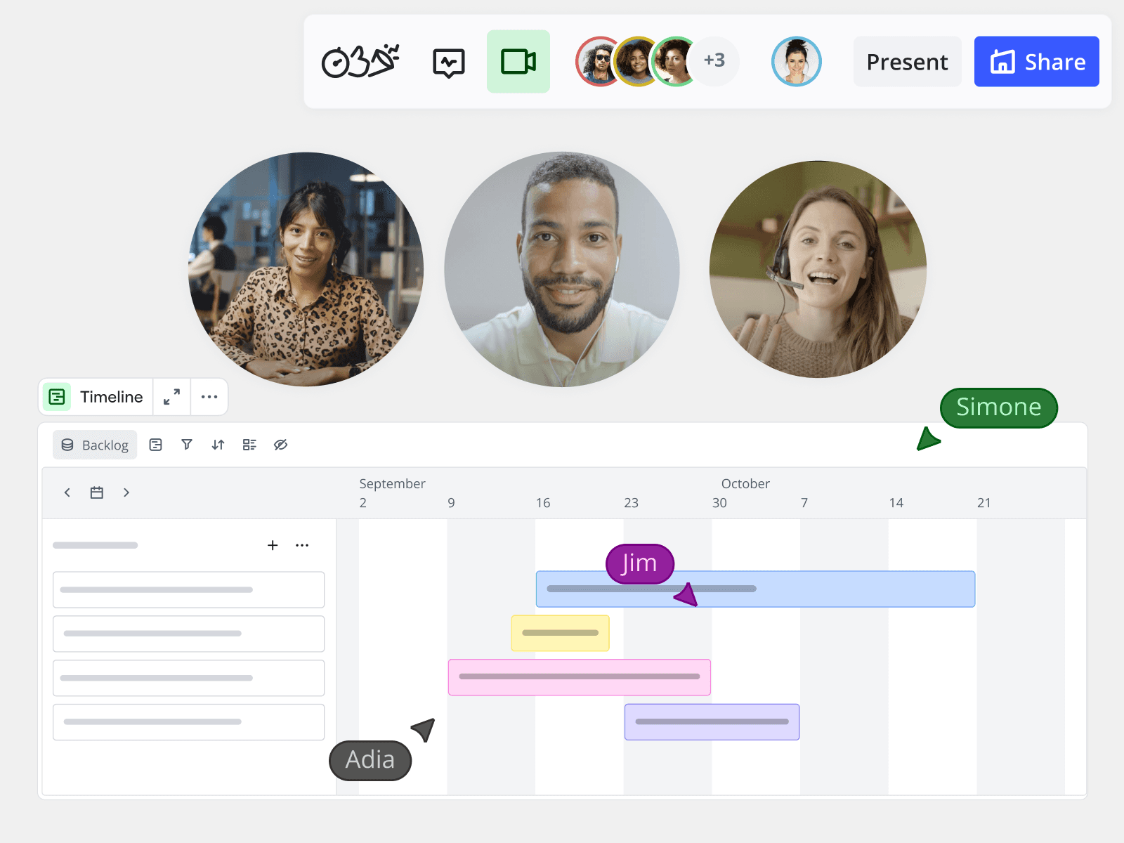 Make video calls right on your Miro board. Tie collaboration and communication together so discussions, decisions, and actions happen in real time without switching tools.